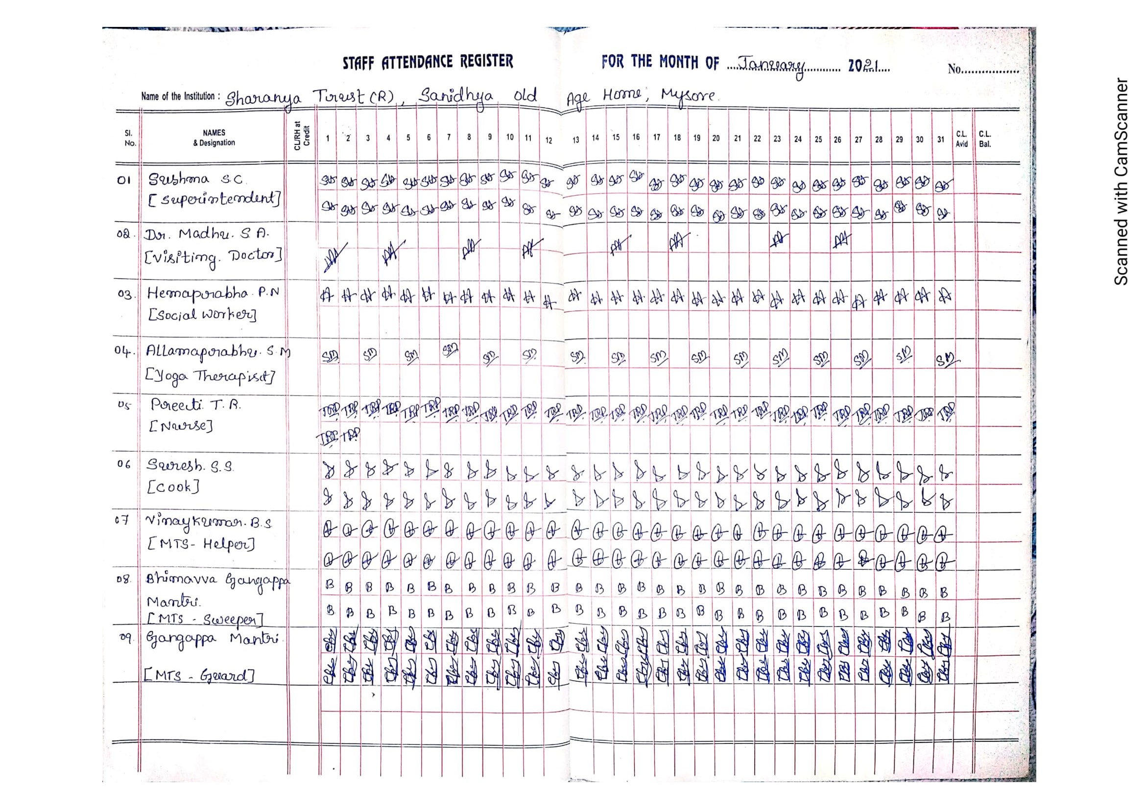 Other Details Click here to view cctv footage* This is an Alert Contact Administrator for more details × Dismiss alert Click here to view staff attendance Staff Details Kitchen Details Staff Details Staff Name Designation Sushma S.C Superintendent Dr. Madhu S.A Visiting Doctor Hemaprabha P.N Social Worker Allamaprabhu Yoga Therapist Preeti T.R Nurse Suresh S.S Cook Gangappa B Mantri Guard [MTS] Bhimavva Sweeper [MTS] Vinay Kumar Helper [MTS] Kitchen Details Particulars Total in Numbers Particulars Total in Numbers Plates 55 Steel Bucket 05 Glasses 60 Silver Basin 05 Cookers 07 Scoop 05 Dish Stand 02 Cylinder 03 Idli Set 03 Cylinder Plates 07 Bowls 25 Dosa Tawa 02 Steel Mugs 02 Coffee/Tea Glasses 50 Hot Box 03 Dosa Turner 02 Coffee Filter 01 Rice serving spoon 05 Tea Kettle 02 Silver boiler 01 Steel Can 03 Steel water Jug 02 Mixer Grinder + Jar 01+03 Coffee Thermo-steel 01 Small plates 20 Knifes 03 Grinder 01 Stove (Small + Big) 03+02 Plastic Buckets 04 Containers 20 Water can 05 Coffee Strainer 03 Dust pan 02 Dust bin 04